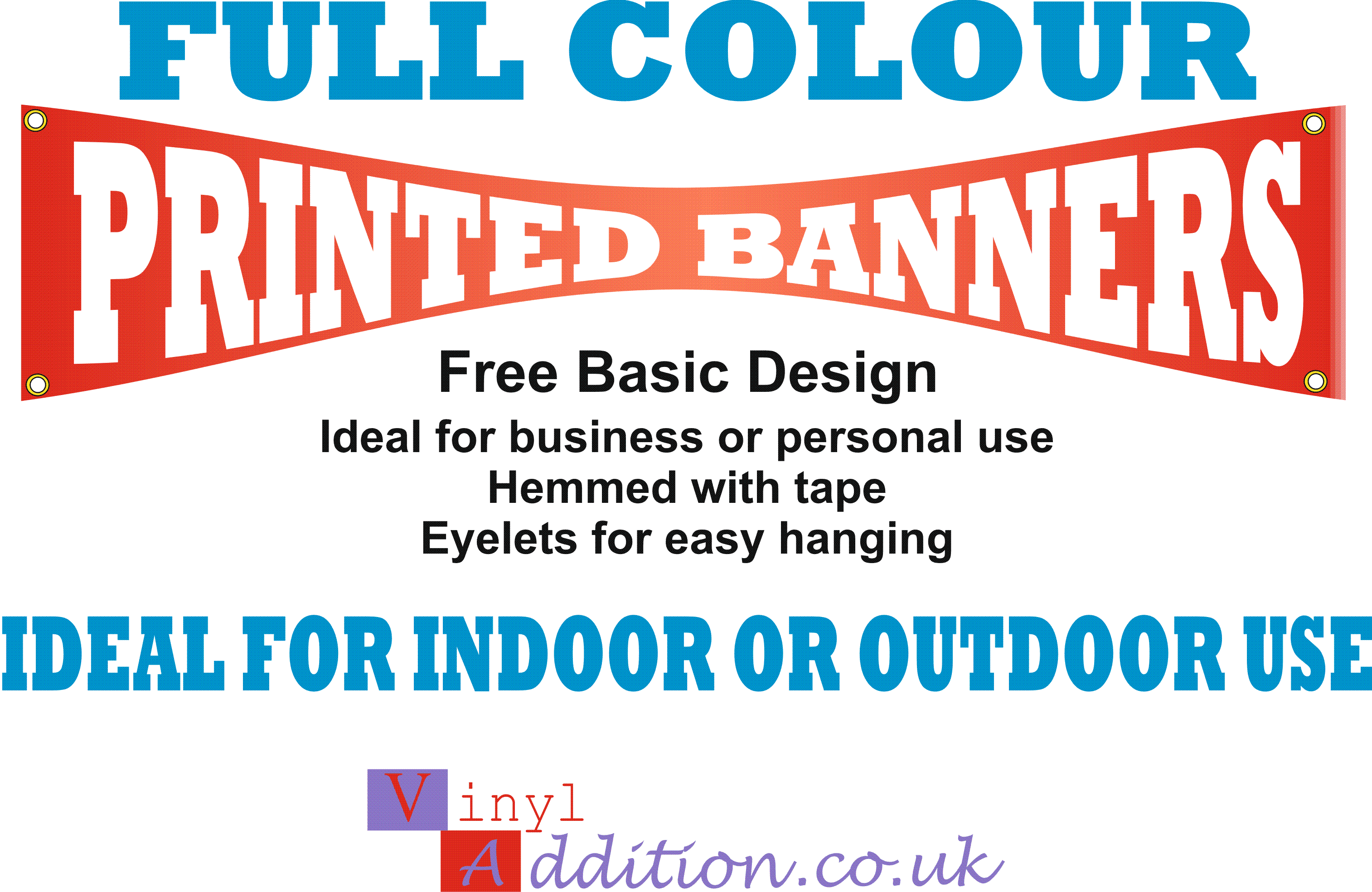 PVC Banners digitally printed in full colour on 440GSM PVC banner material. Hemmed all round and eyelets as standard, printed with solvent ink for use indoors or outdoors.